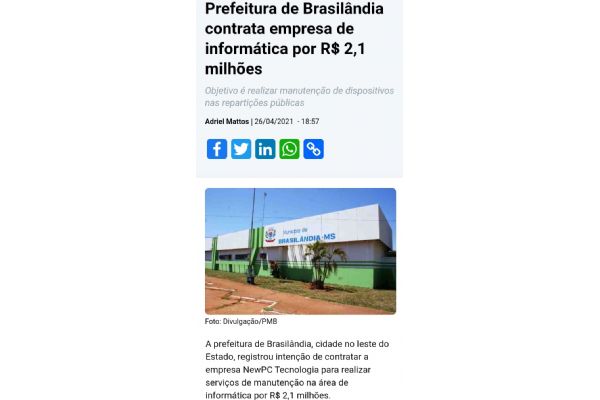 Prefeitura de Brasilândia contrata empresa de informática por R$ 2,1 milhões
